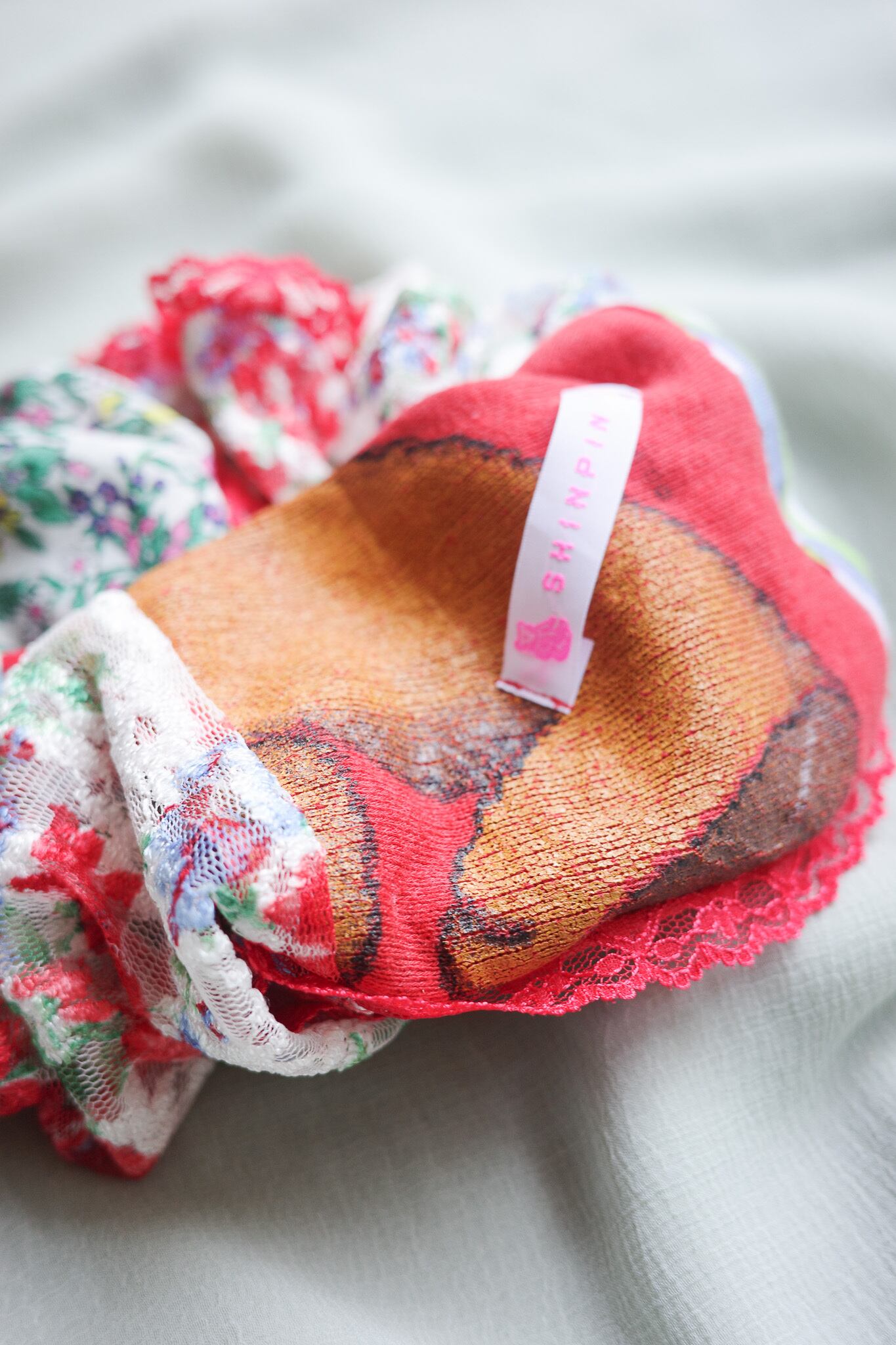 さまざまな生地を組み合わせたシュシュ ୨୧