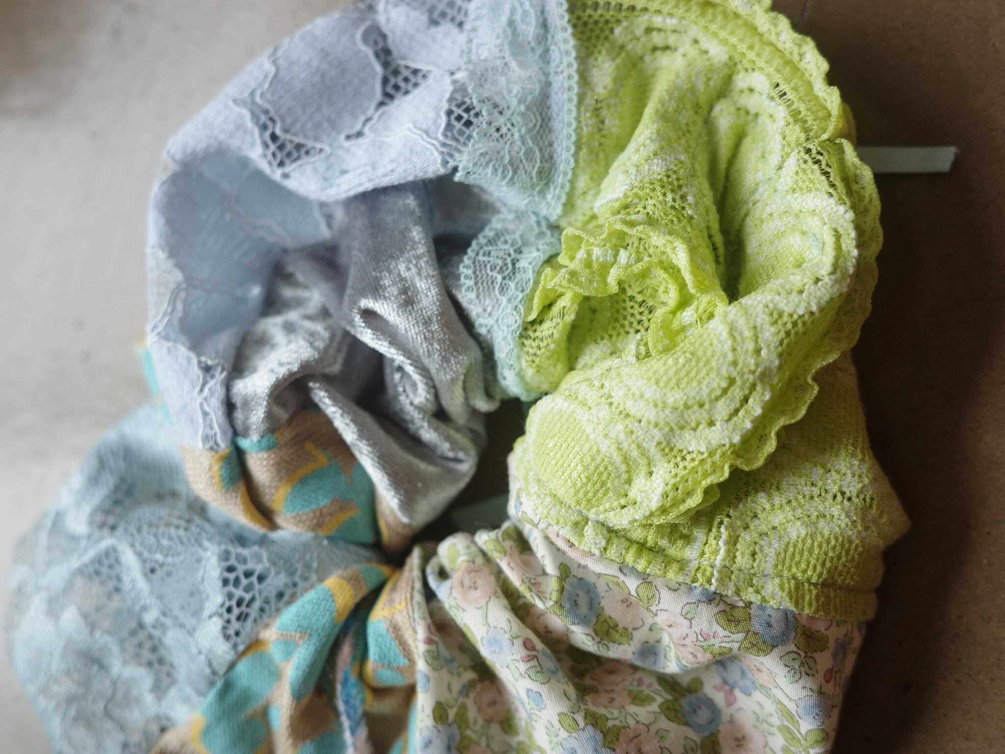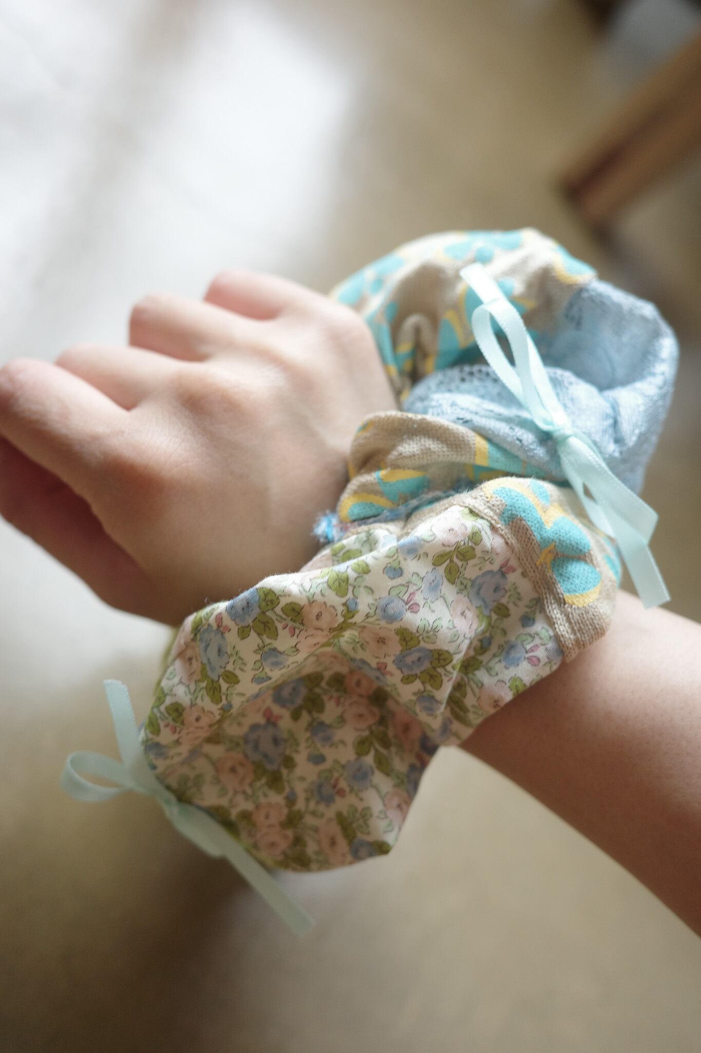 さまざまな生地を組み合わせたシュシュ ୨୧