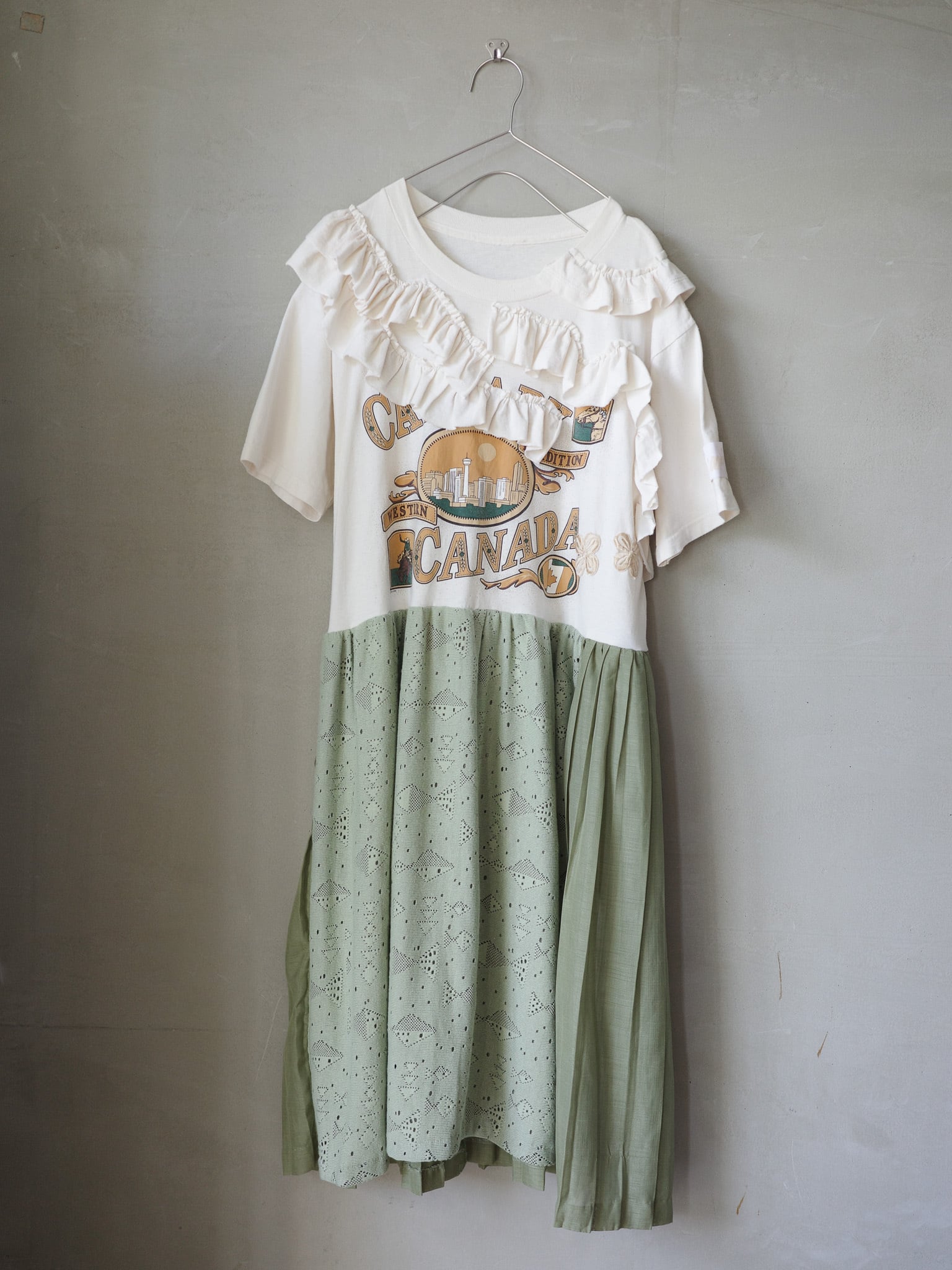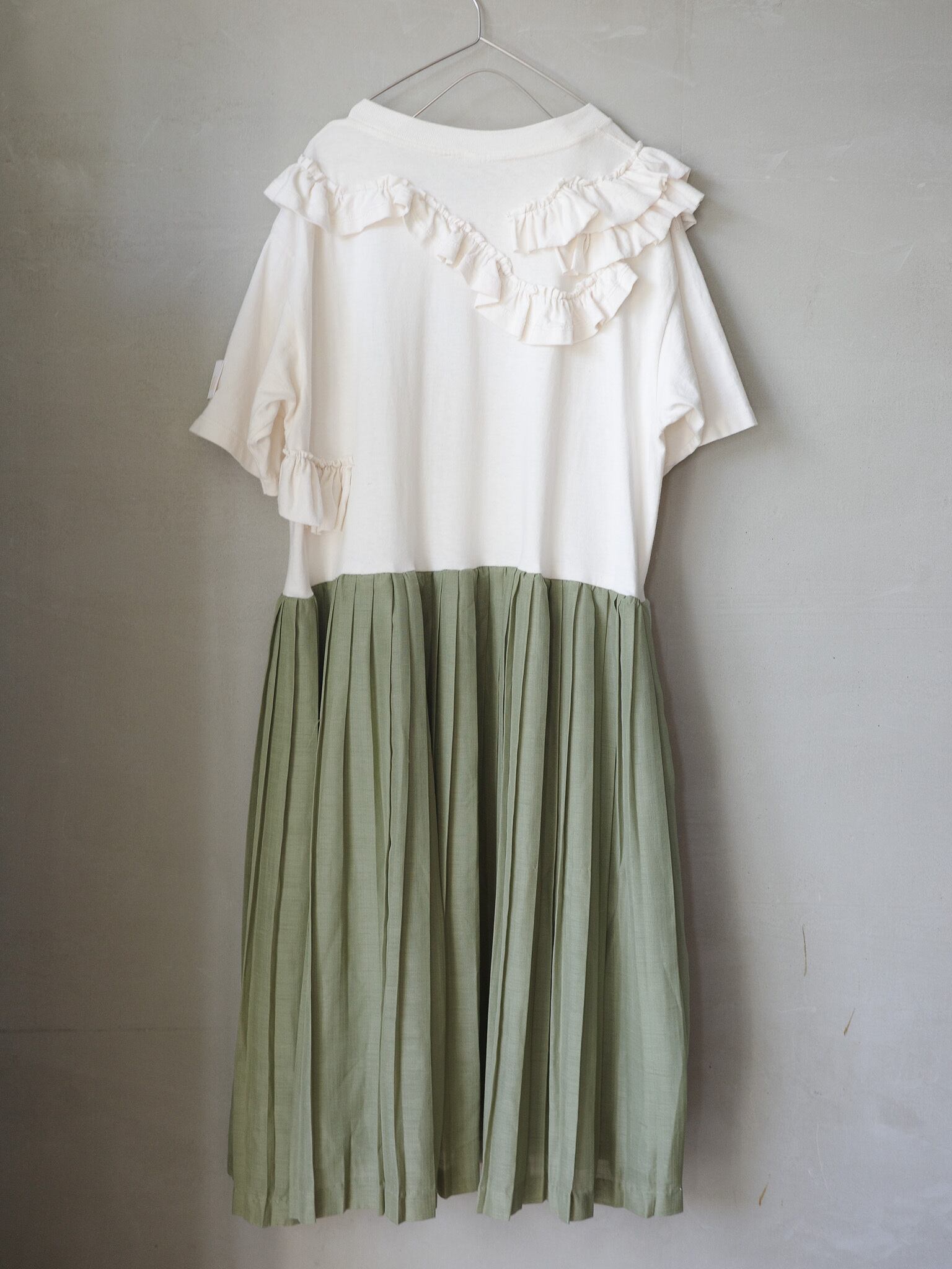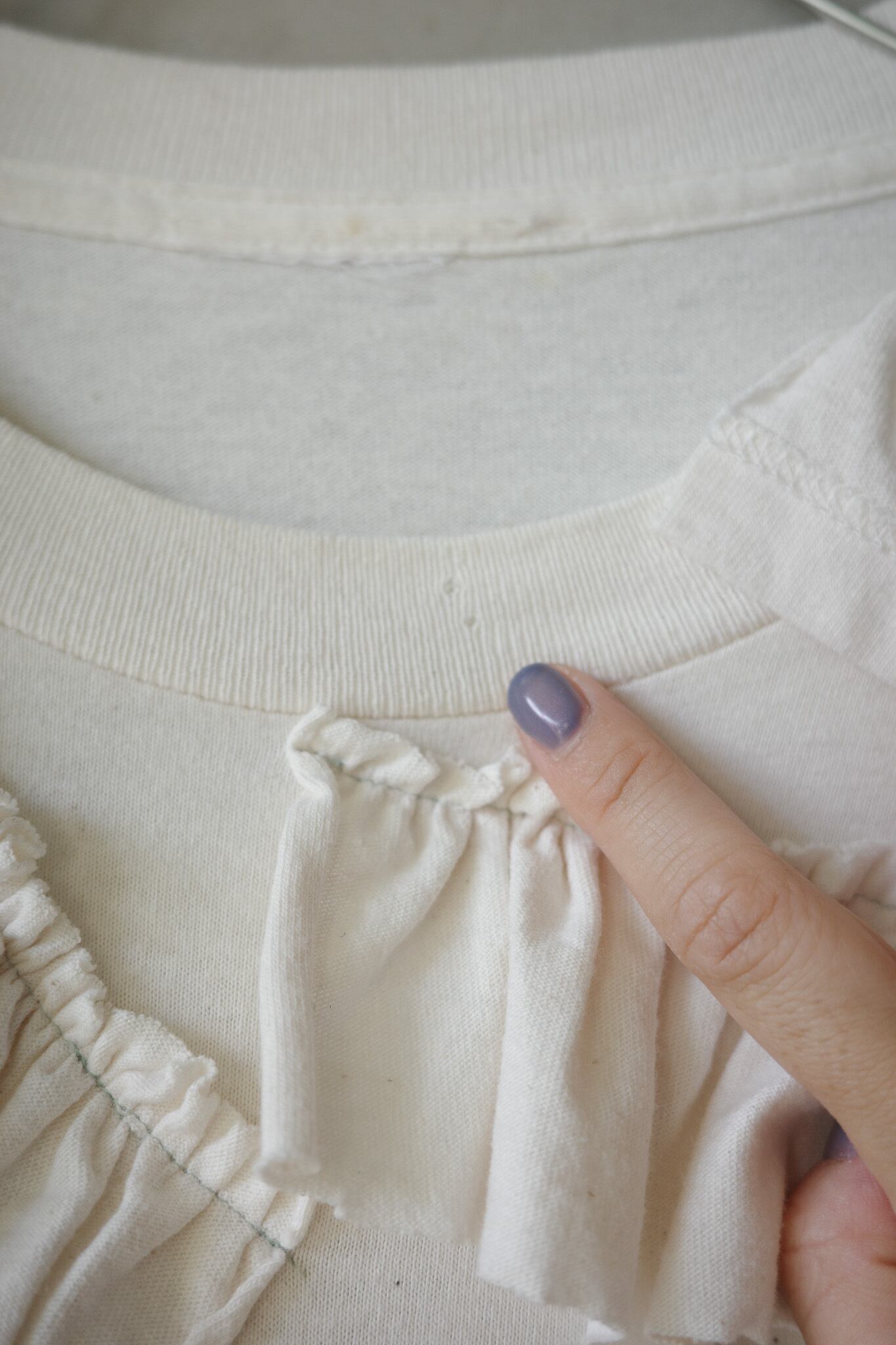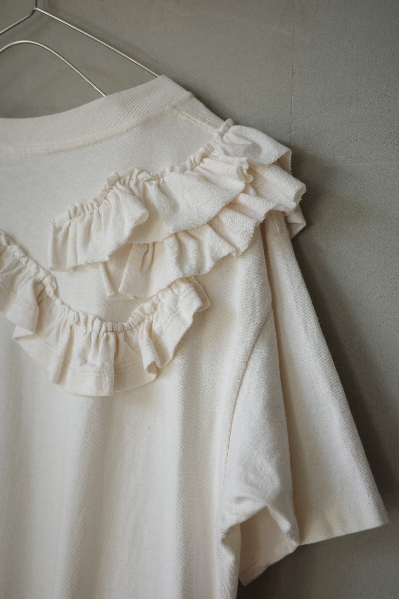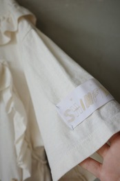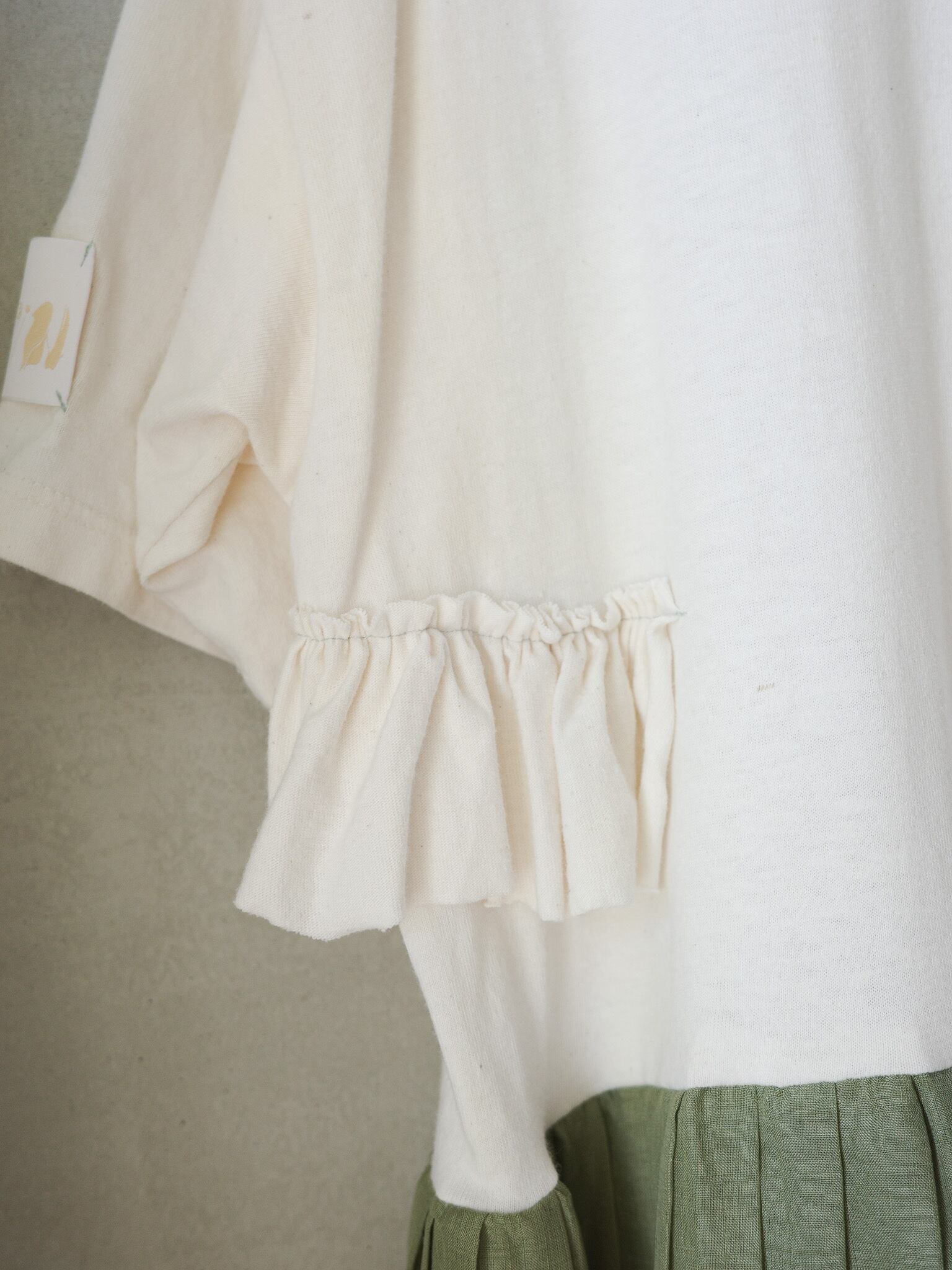同生地でフリルをちりばめました。フリルは無造作、切りっぱなしでラフな雰囲気に。