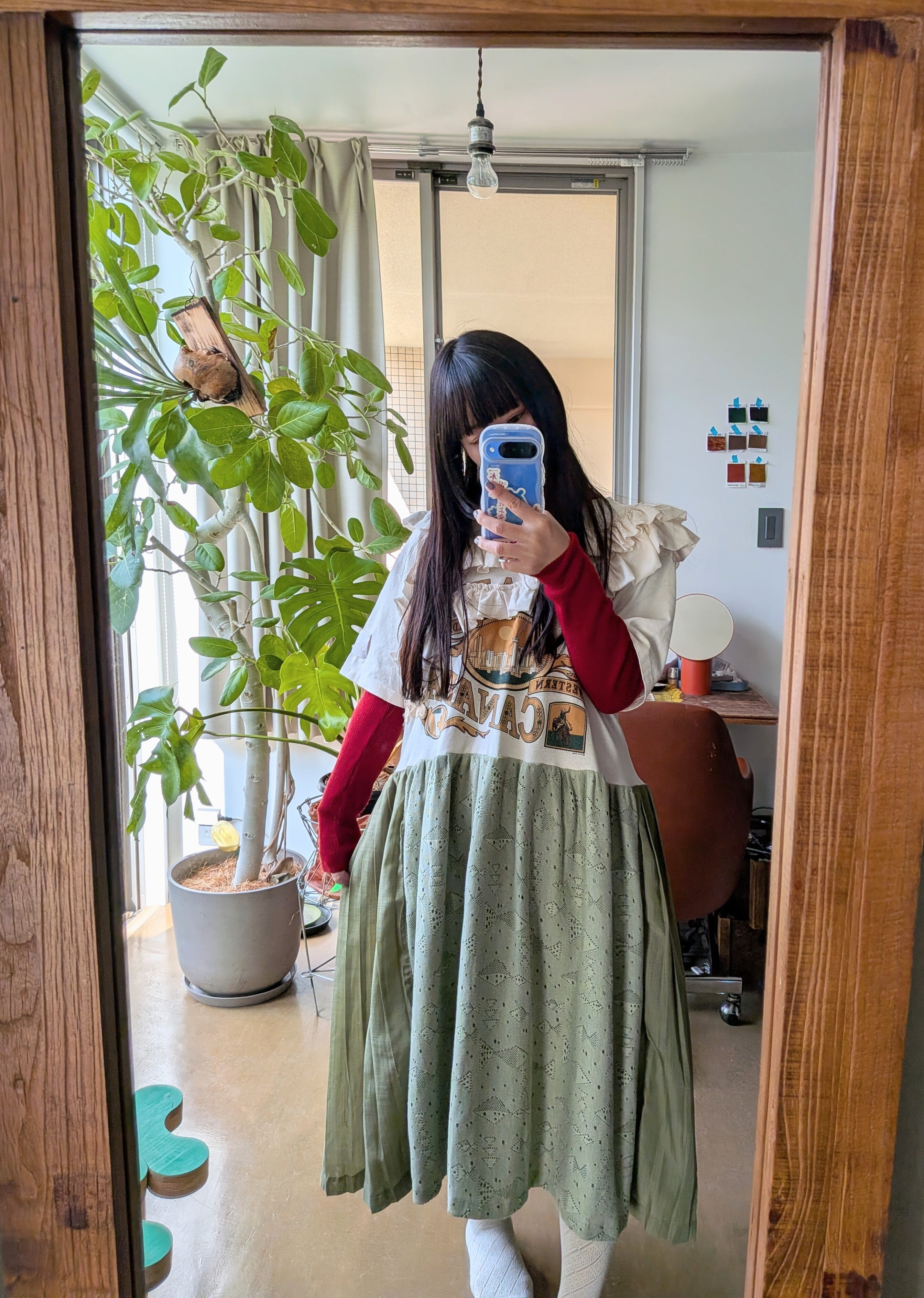 スカートは落ち着いたグリーンのプリーツと、おさかなモチーフのレースのパンチング加工がされた生地です。裏地付きなので透ける心配はありません〇