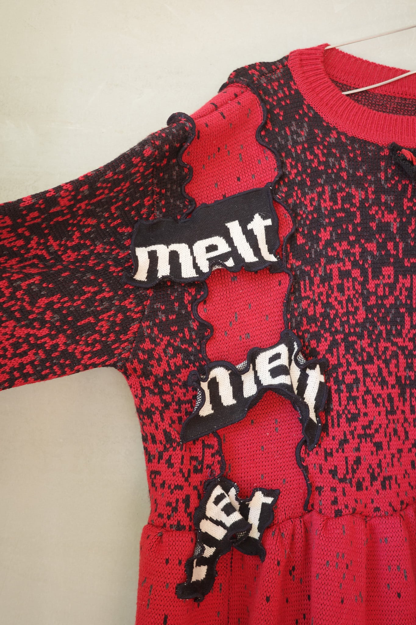 サイドにはmeltの文字。文字にあわせてとろけるような縫い付け方とメロウ加工をしました。