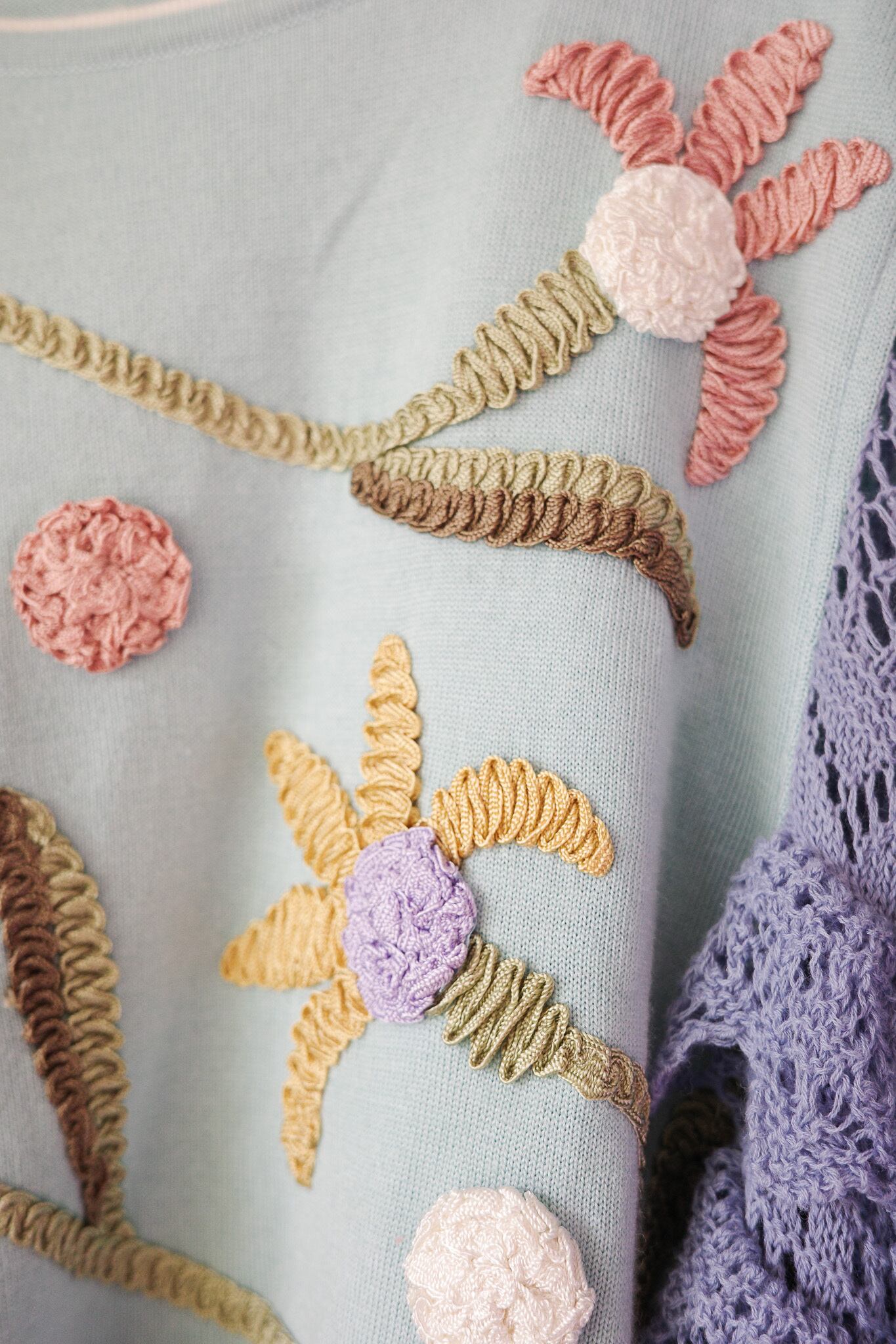 お花柄は、太めのコードを縫い付けて描かれた立体感のあるデザインです。