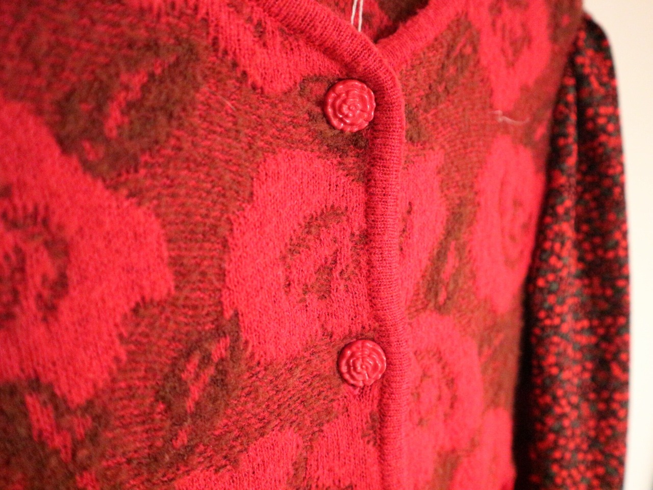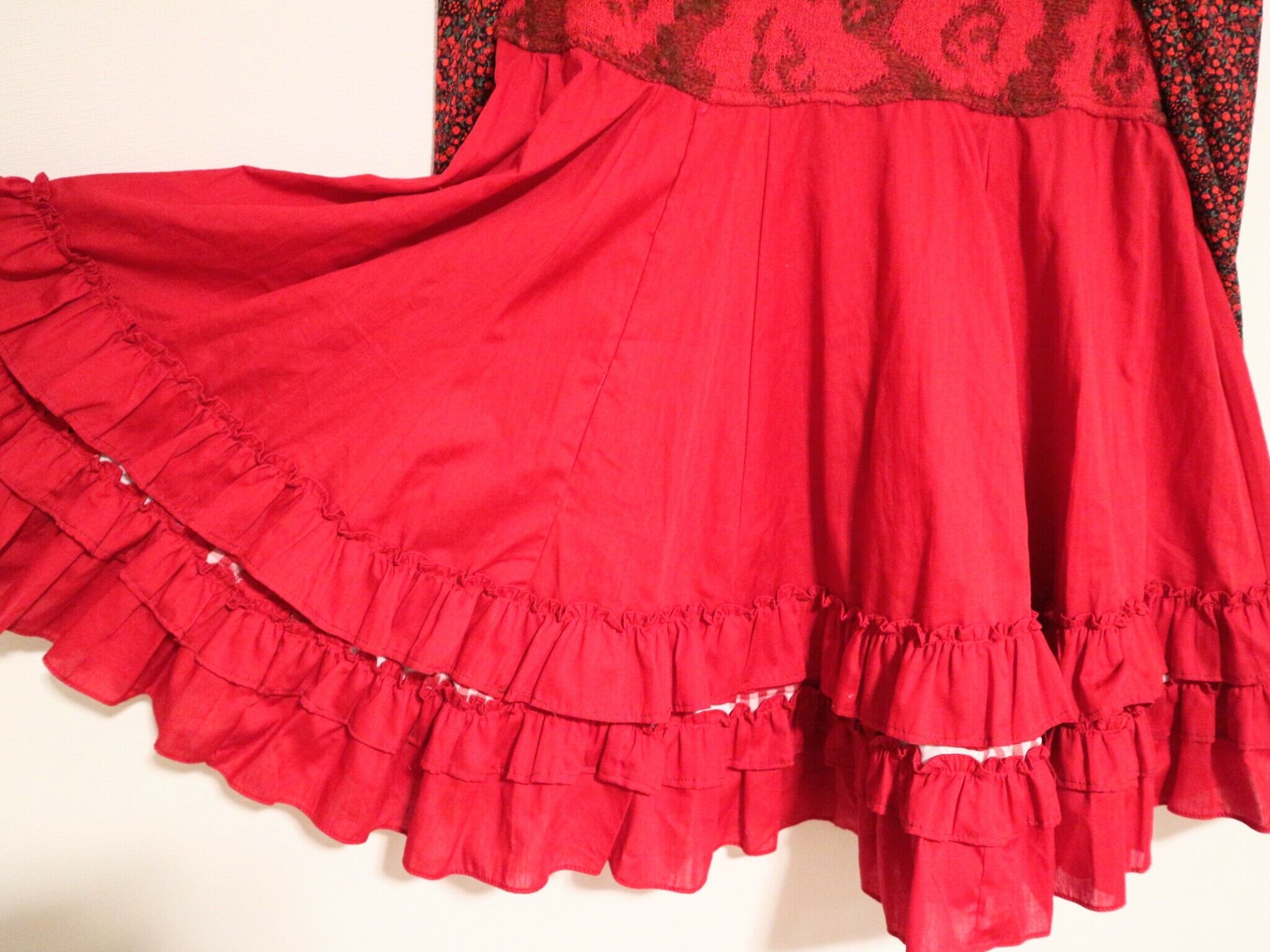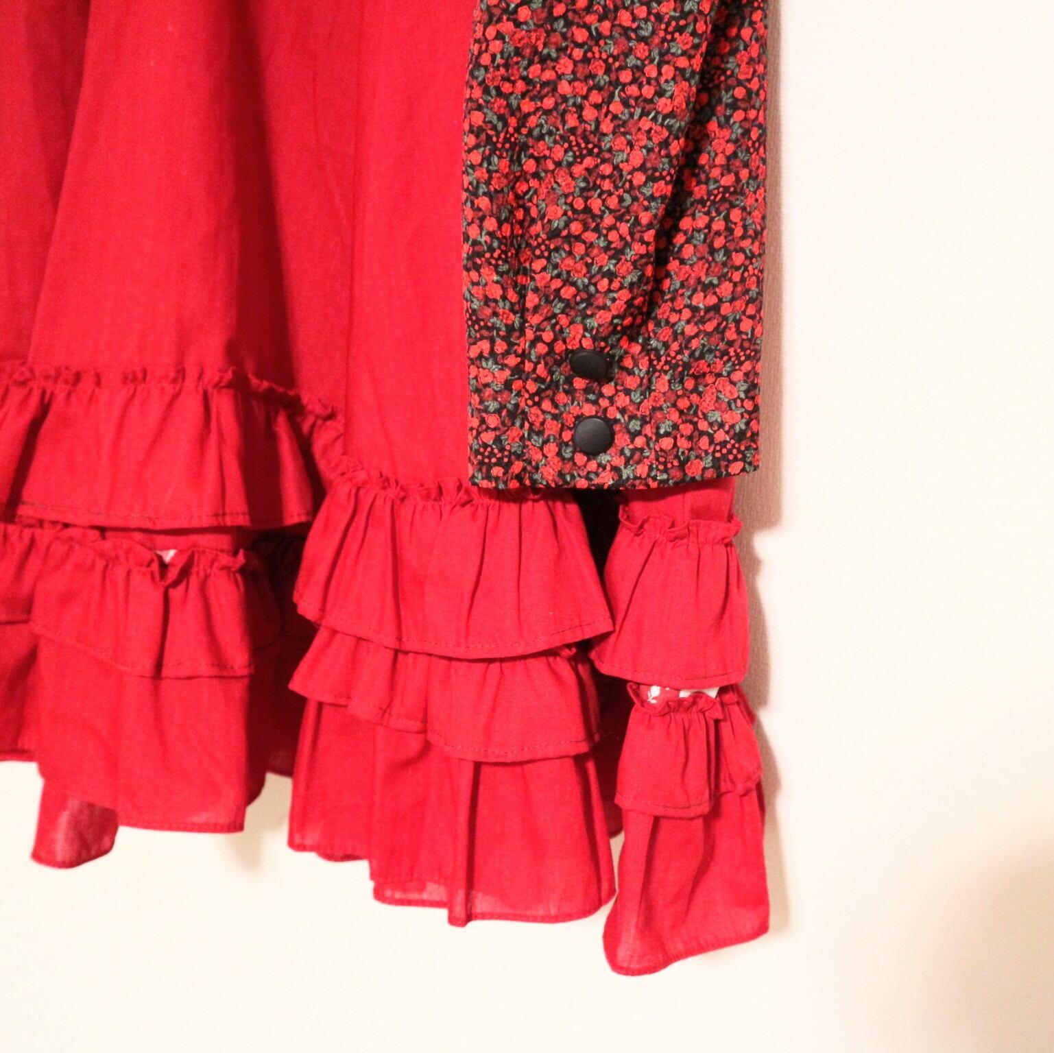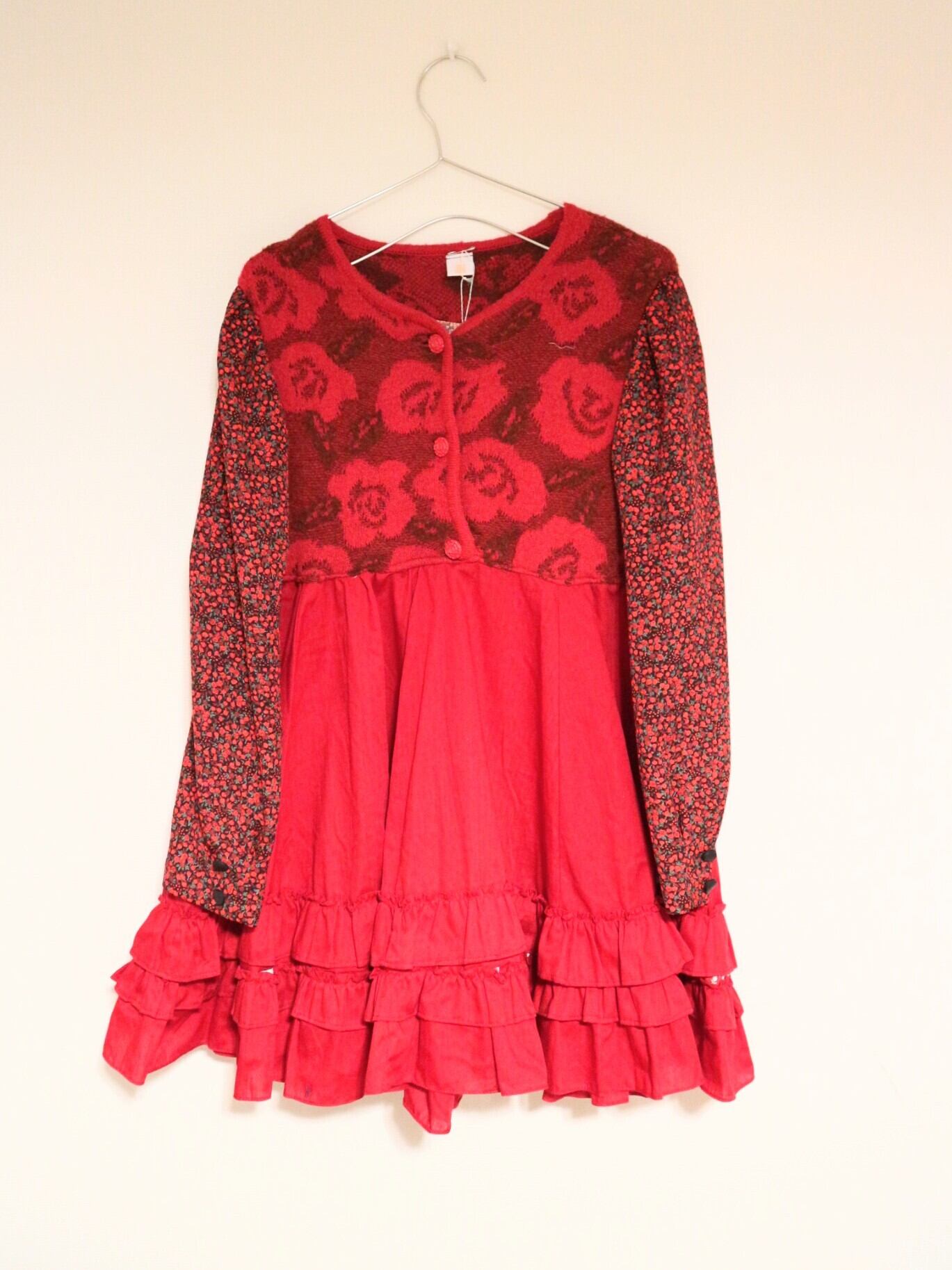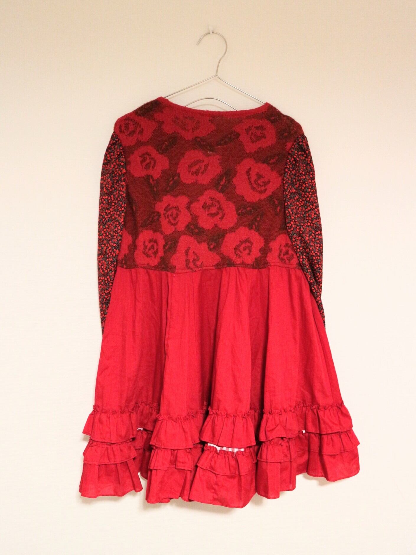 ホットピンク✕赤色お花柄ニットにフリルたっぷりのスカートをあわせました。