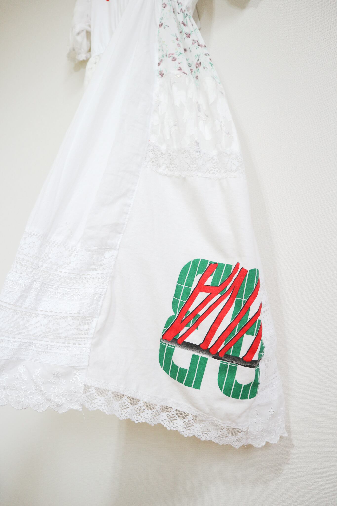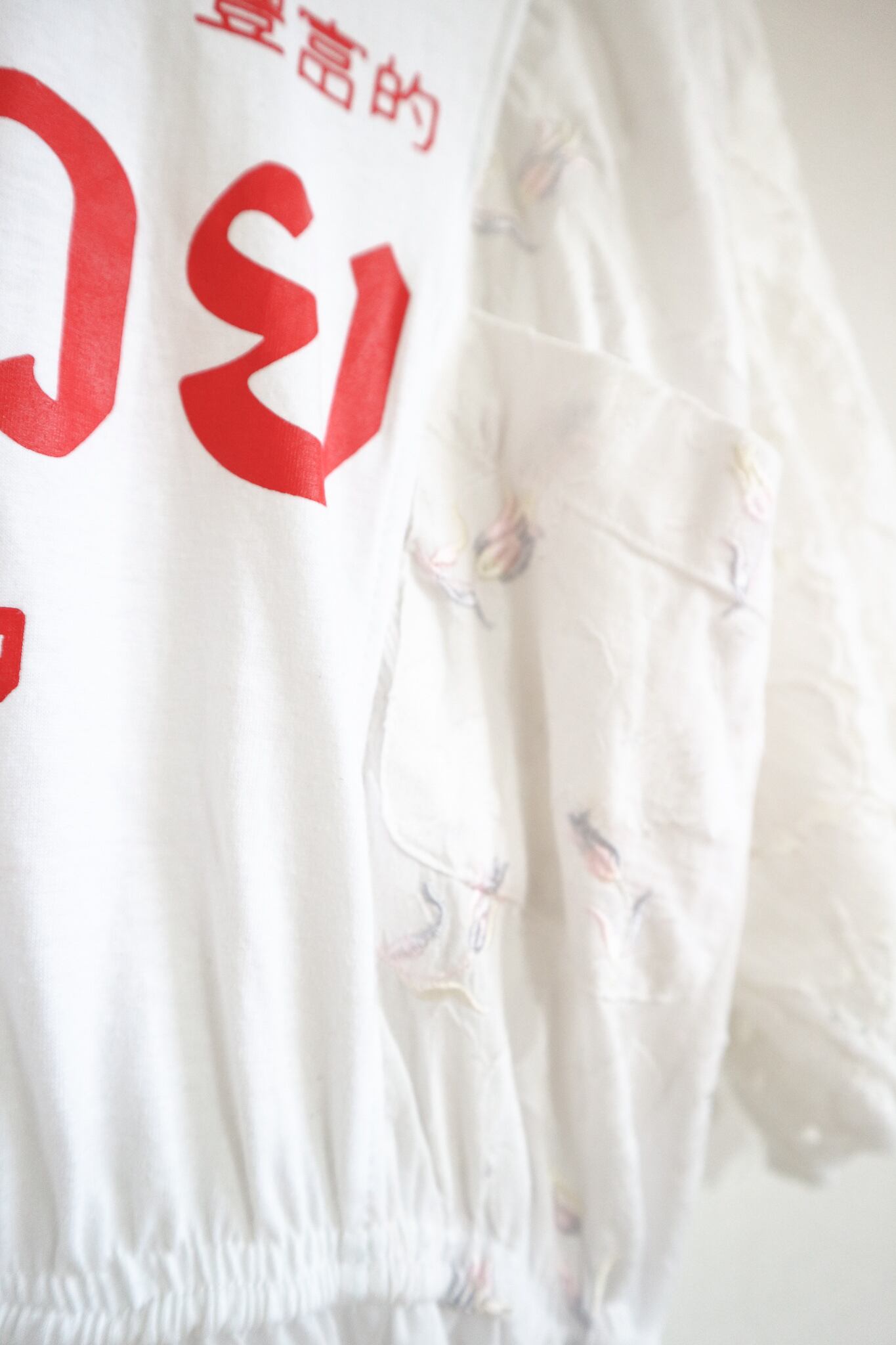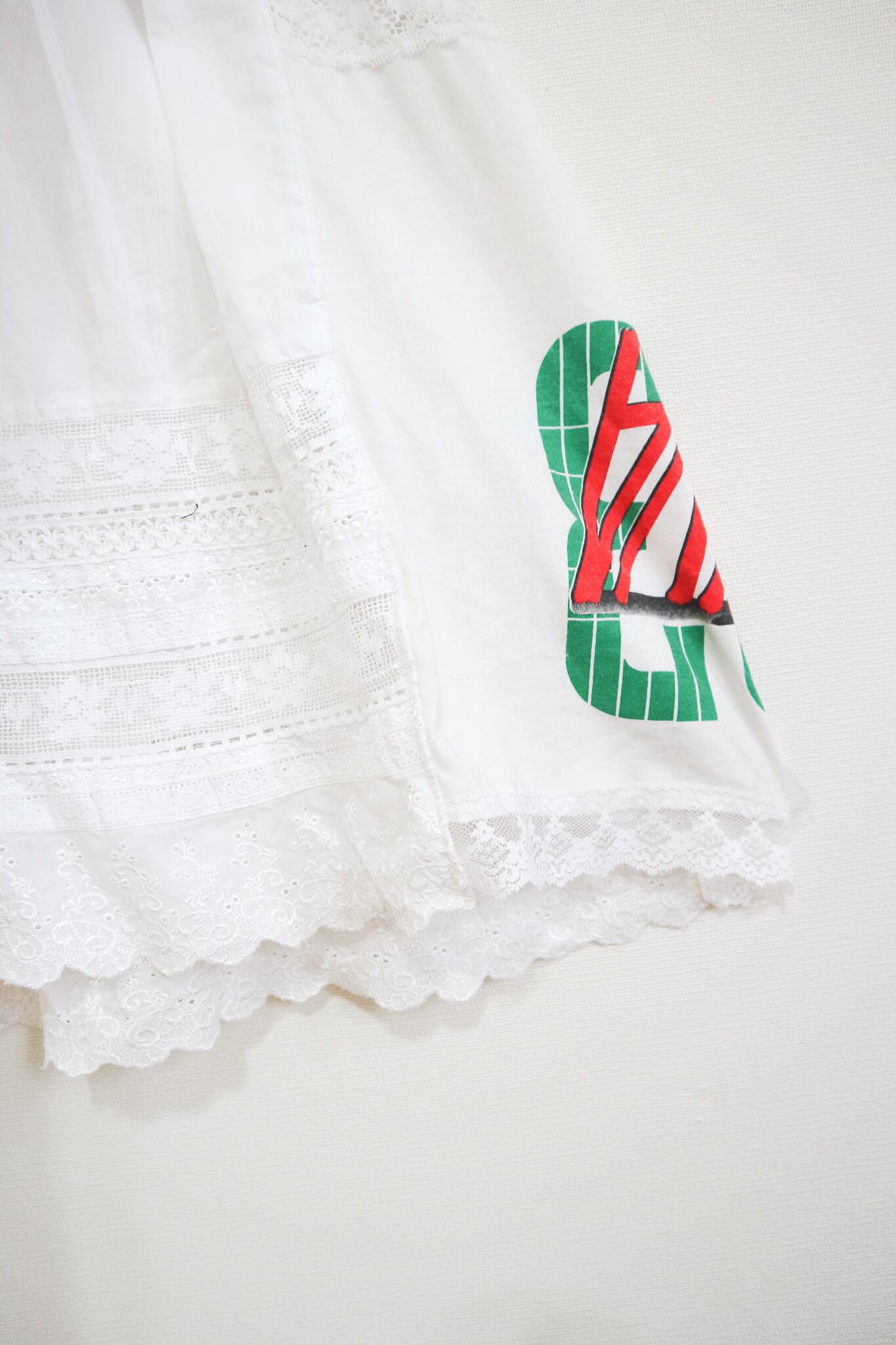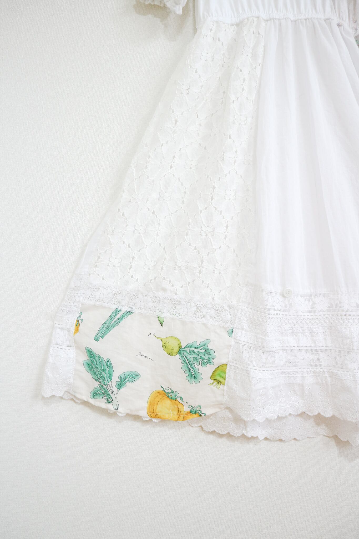 お袖まわりのコットンはパステルカラーのチューリップが刺繍された布地、スカートにはヴィンテージのコットンスカートを使用しています。