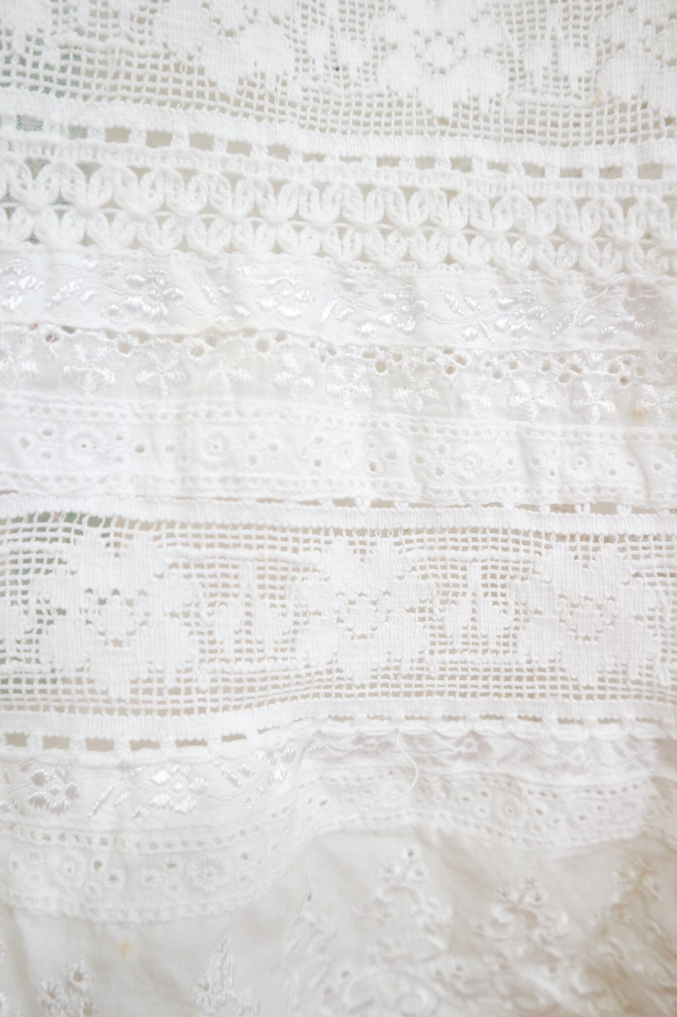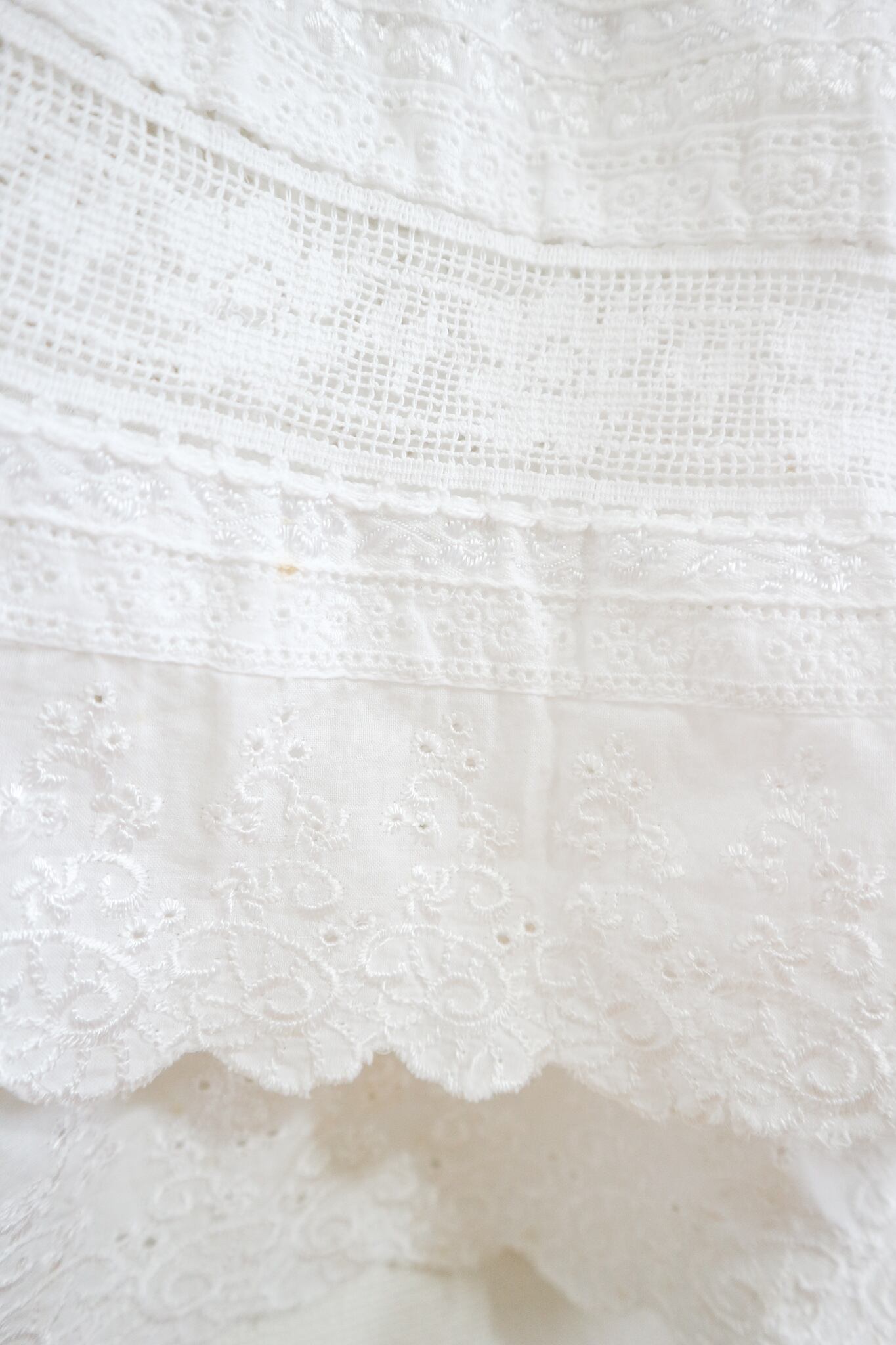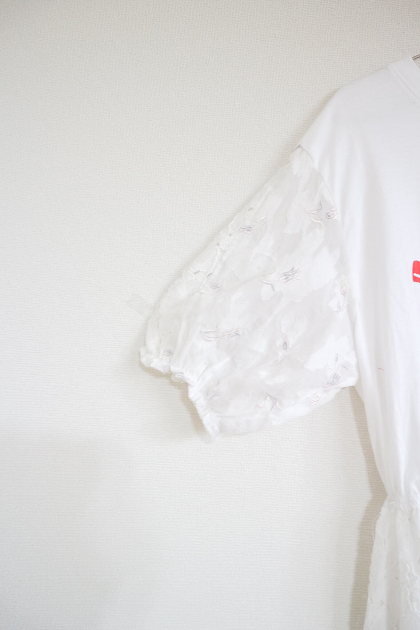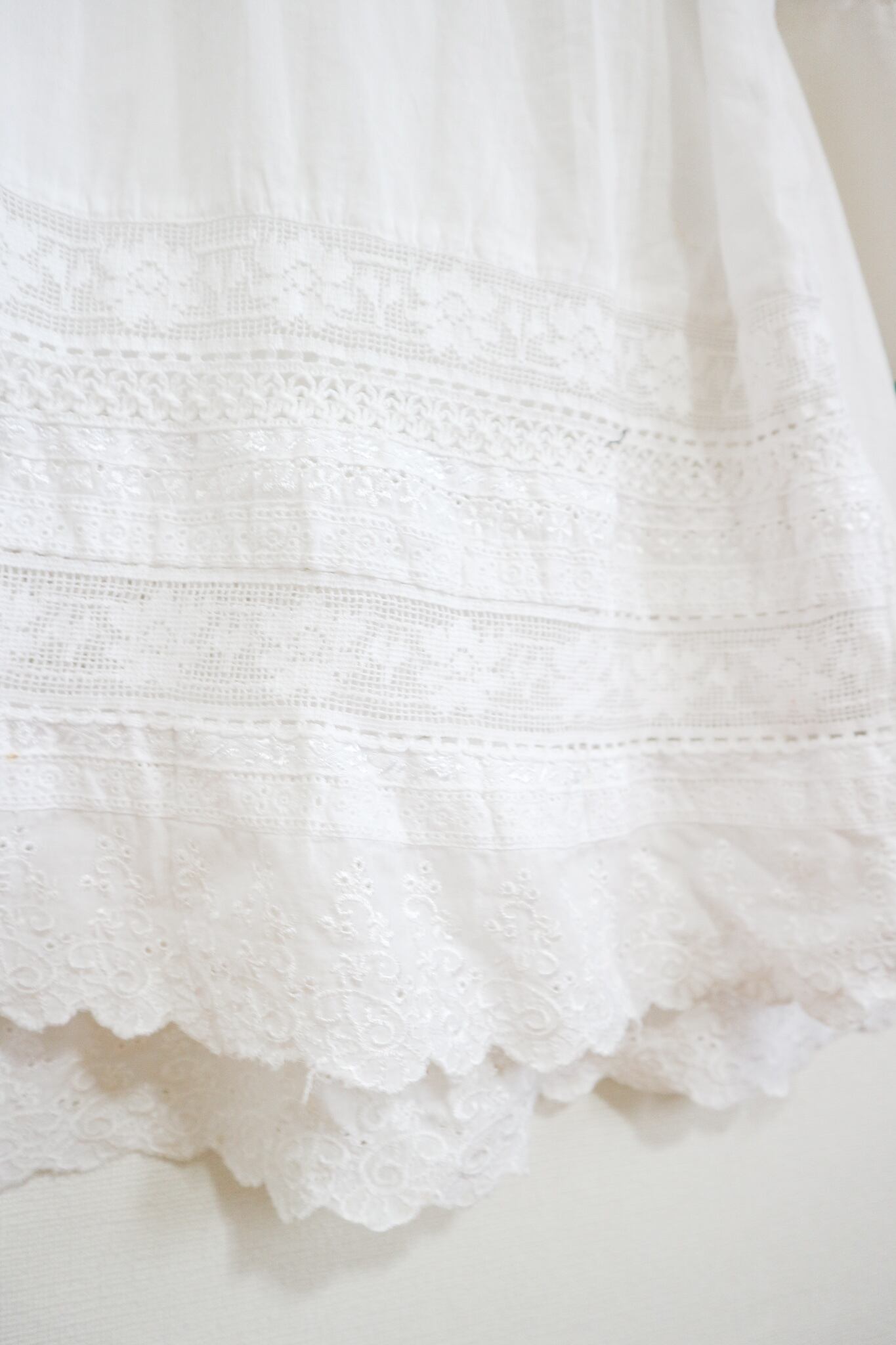 お袖まわりのコットンはパステルカラーのチューリップが刺繍された布地、スカートにはヴィンテージのコットンスカートを使用しています。