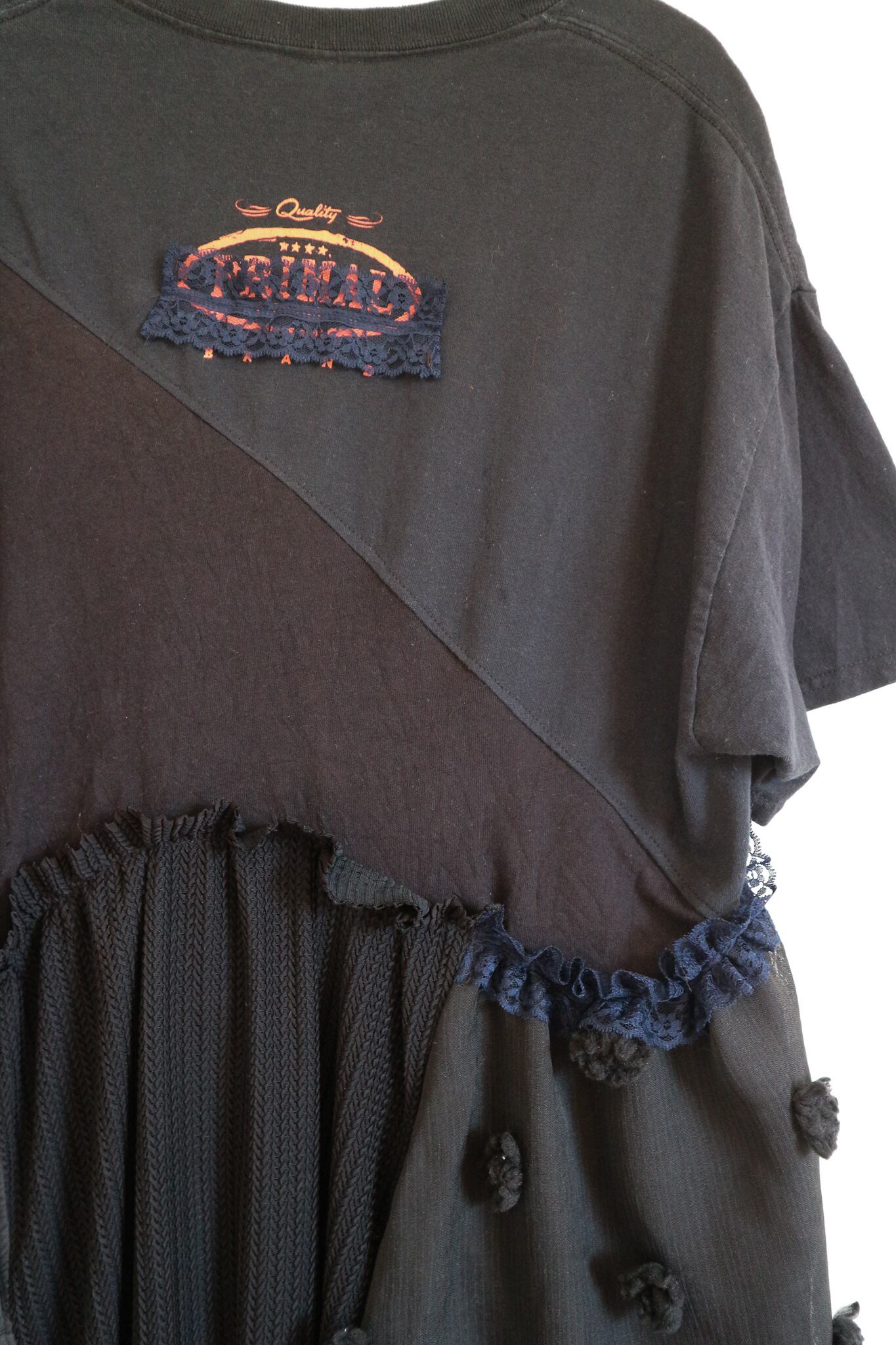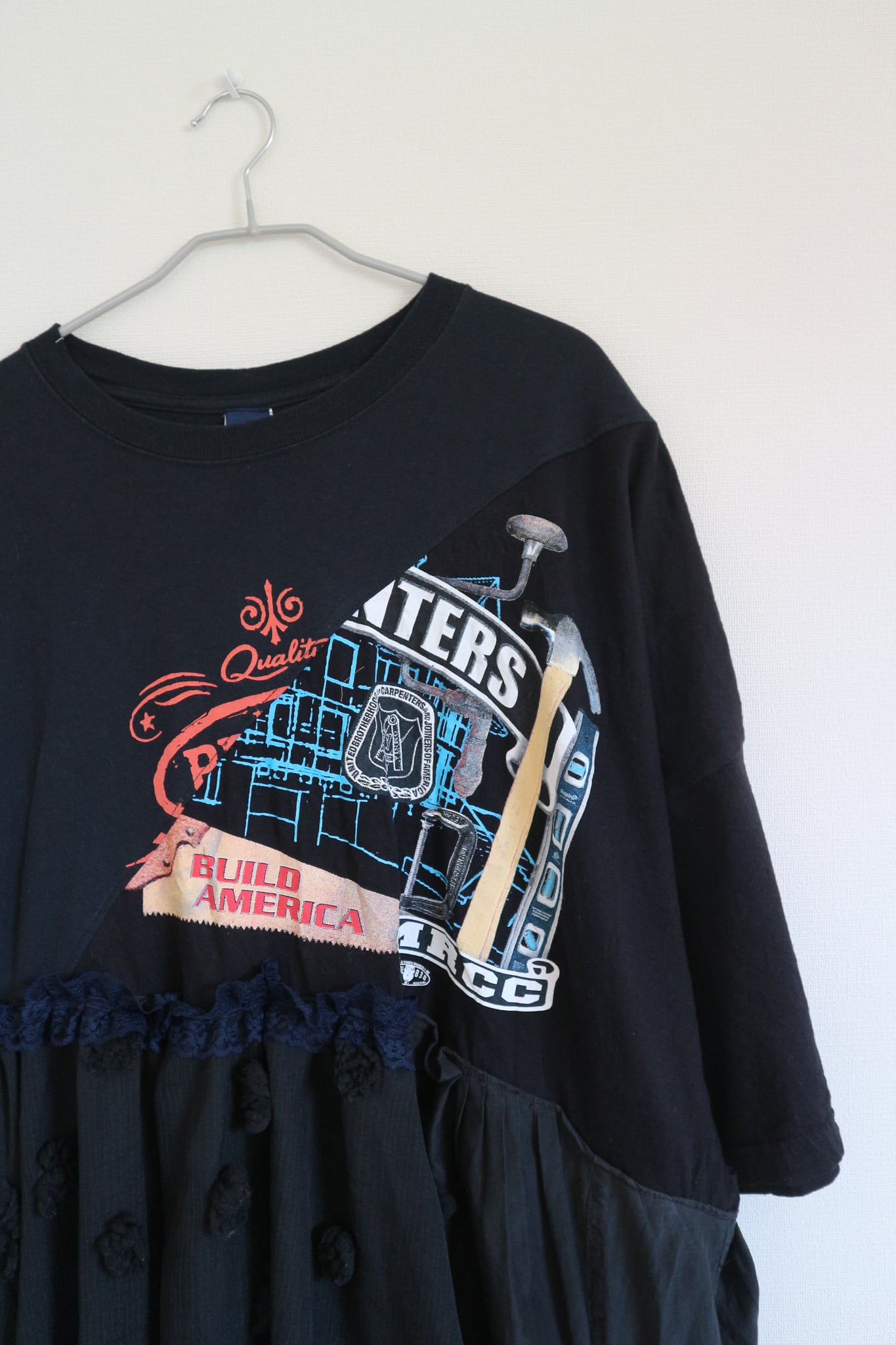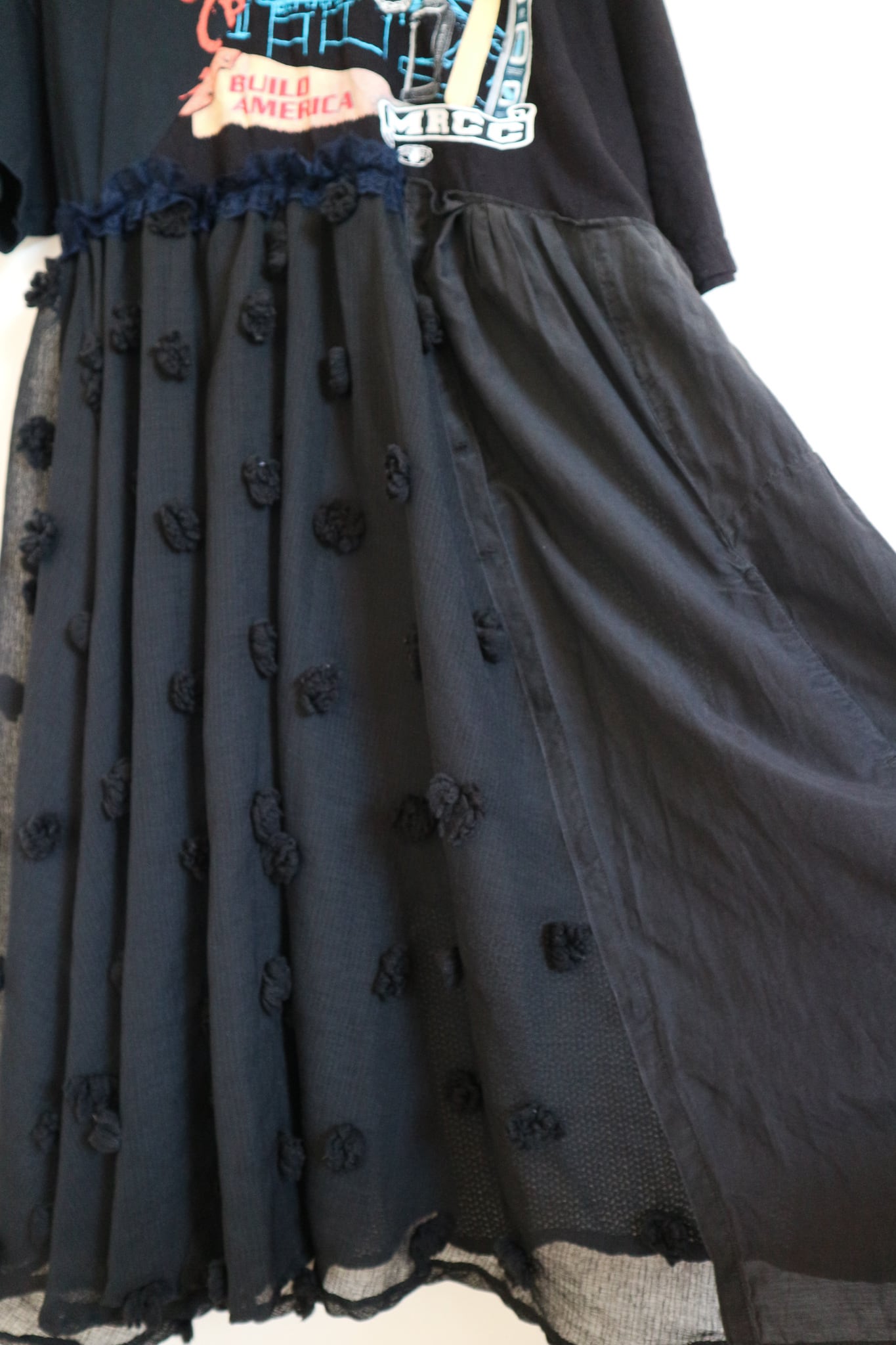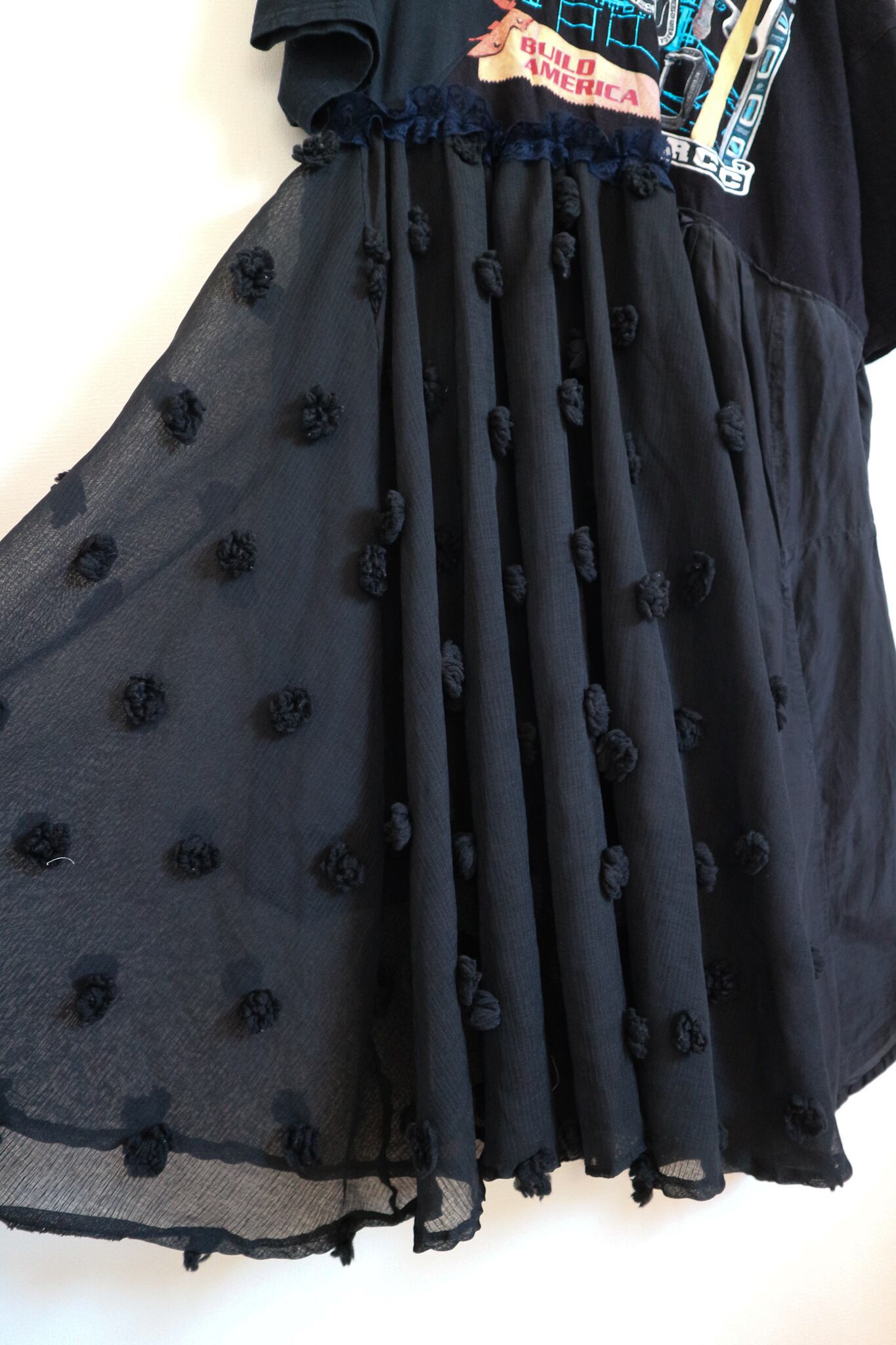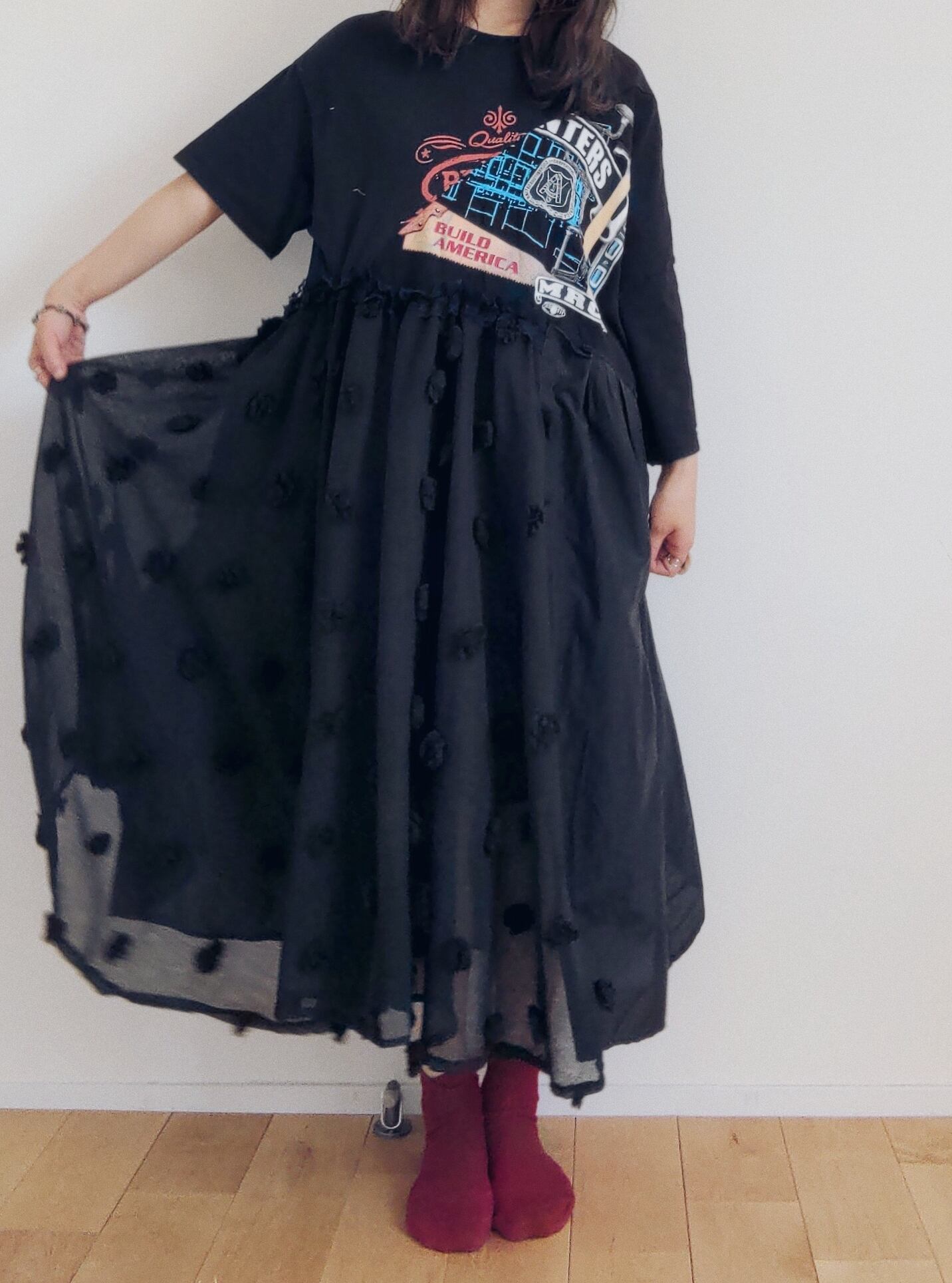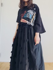 ごつめのプリントに、ふわっとしたスカートとレースでかわいくかっこよく着られます。